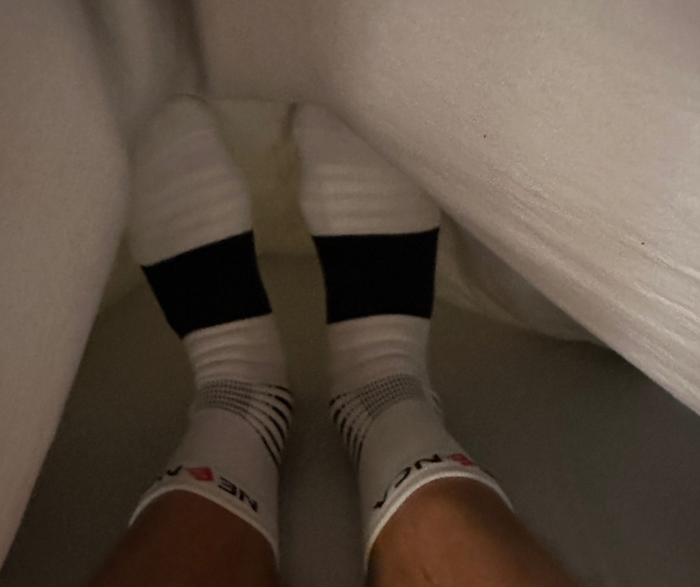 Debbie did not look impressed (or remotely turned on) as I climbed into bed with these compression socks strangling my feet.
