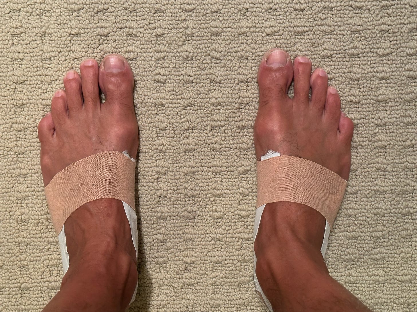 I’m nervous. Taped feet, sore hamstrings, glutes, and IT bands, and now a pulled Soleus muscle in my right leg... I’m a mess!